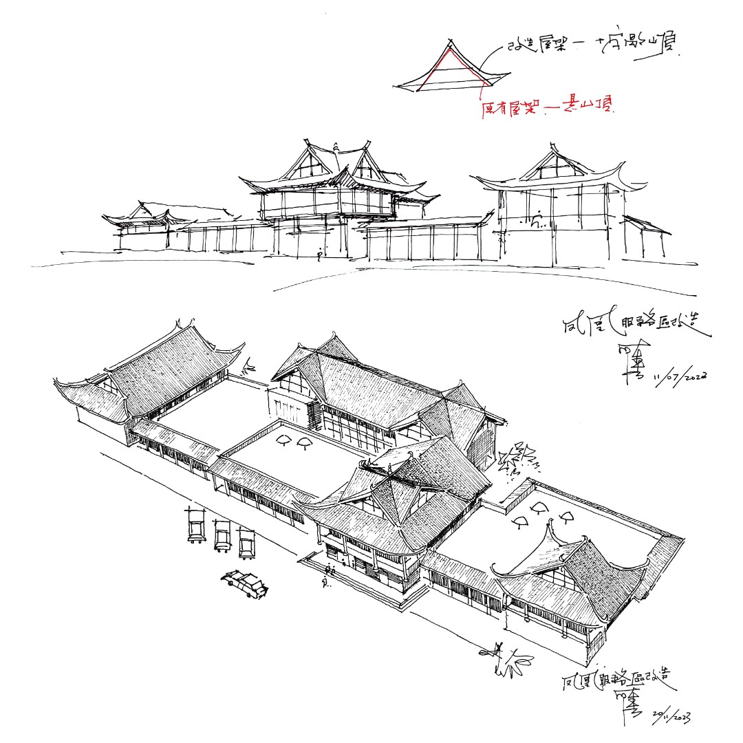 服务区建筑立面的改造设计为项目一大亮点。设计团队深入挖掘当地传统民居元素,通过歇山顶屋架形式和飞檐翘角等传统构造彰显苗寨风情,使服务区在保持现代服务功能便捷性、舒适性的同时,又充满了吊楼古韵、水乡风情的地域特色。