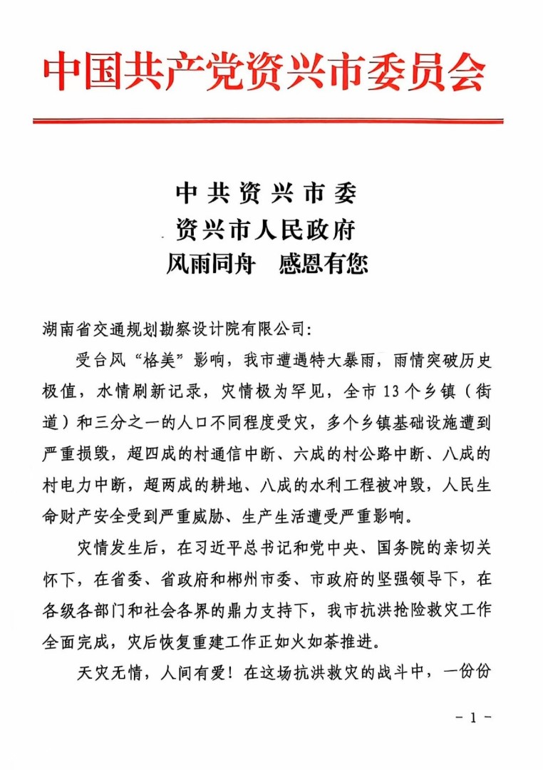 近日,中共资兴市委、资兴市人民政府发来感谢信,信中高度评价了香港六和宝典全年资料在驰援资兴抢险救灾及灾后恢复重建工作中展现的担当精神和技术水平,对公司作出的积极贡献表达了诚挚的感谢。信中指出,资兴市此次遭遇灾情极为罕见,多地基础设施遭到严重损毁、大范...
