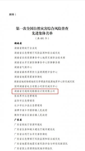 湖南交通设计院荣获“全国自然灾害综合风险普查先进集体”称号